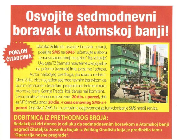 Ukoliko želite da osvojite boravak banji, pošaljite SMS na 6945 i učestvujte u izboru tema za naredni broj magazina "Top zdravlje". Ukucajte TZ (razmak) naziv teme o kojoj želite da se piše u magazinu (razmak) Vaše ime, prezime i adresu. Autor najboljeg predloga, po izboru redakcijskog žirija, biće nagrađen sedmodnevnim boravkom(sa punim pansionom, lekarskim pregledima i tretmanima) u Atomskoj banji Gornja Trepča. Cena poruke za Telenor mrežu iznosi 20 din. + porezi, dok za mt:s mrežu iznosi 20 din. + cena osnovnog SMS-a + porezi. Oglašivač A&K d.o.o. preuzima odgovornost za funkcionisanje SMS medij servisa.